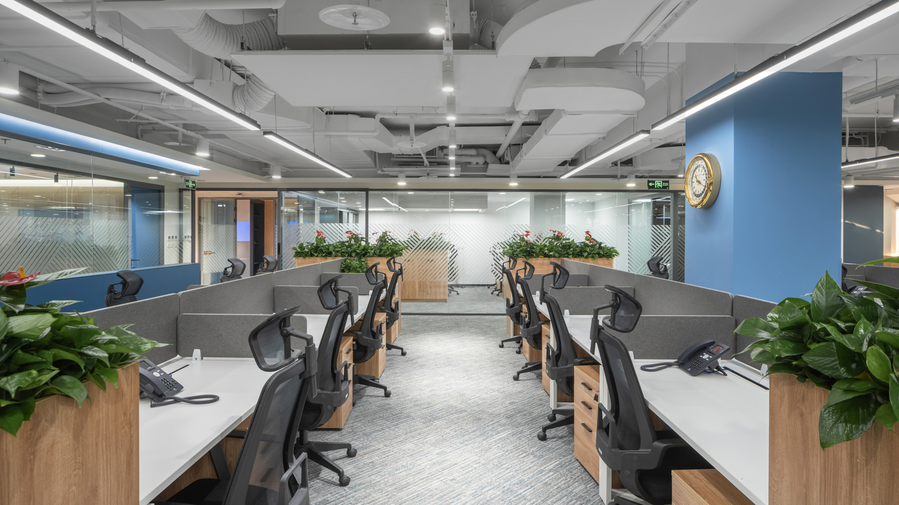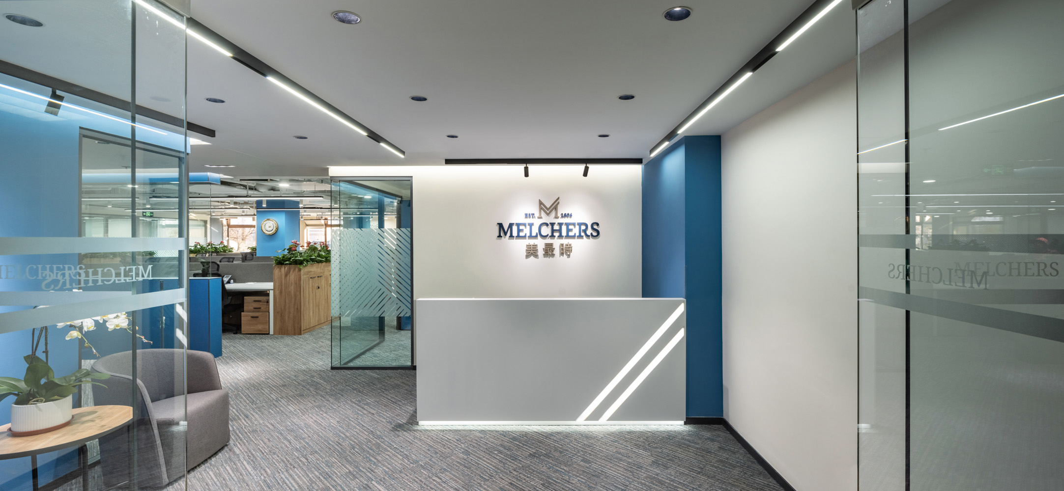 5 Star Plus Retail Design was assigned to re-design Melchers China’s existing office in Beijing and translate the brand’s new visual identity into a physical environment. Diagonal, clean lines that represent modernity and the speed of development are implemented across several elements: the reception desk, the pattern of the carpet, wall panels, and decoration of the glass walls. The gold and blue color scheme represent the more than 200 years of history of the company. The blue, in particular, represents the Melchers’ values of integrity, assurance, and loyalty, as well as diligence, growth, and harmony. The office design is a mix of formal as well as informal work and meeting spaces and includes a variety of niche and spacious areas to increase the well-being of employees. The three formal meeting rooms are named based on the cities where Melchers has its headquarters and important bases in China: Bremen, Hong Kong, and Beijing. The informal spaces have varied seating including café-style benches, round tables, and high tables, to encourage employee interaction and communication.