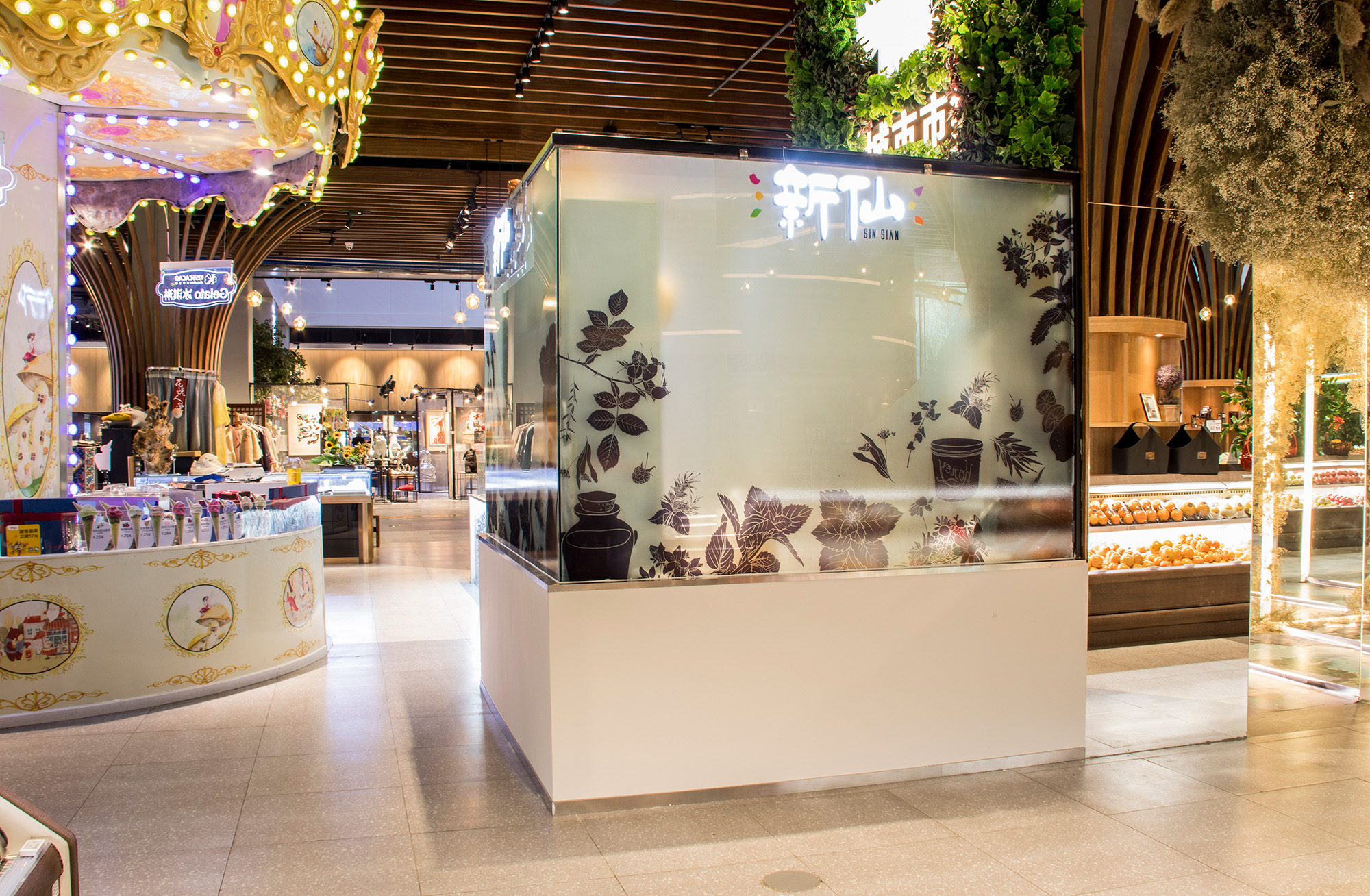Sinsian Black Jelly Brand, a new grass jelly dessert brand, requested 5 Star Plus Retail Design to create a store concept design for their premier location within Beijing’s Hello Mart shopping market. The flagship store design was inspired by Sinsian’s brand identity of tradition, health, and purity. For this store design, the minimalistic features are meant to showcase the product instead of diverting attention away from it. The back walls are adorned with hand-drawn motifs of natural herbs and leaves to highlight the fresh quality of the jelly; light, warm colors accent the traditional dark fish scale tiles decorated across the bar. The see-through kitchen window draws the customers’ attention and reflects the transparency of the brand and the belief in their product.